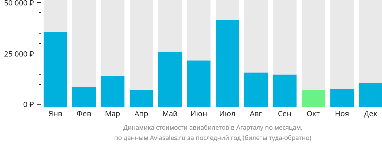 Наибольшей популярностью билеты в Агарталу пользуются в марте, апреле и сентябре. Низким сезоном для покупки билетов является Февраль, Июль и Декабрь.