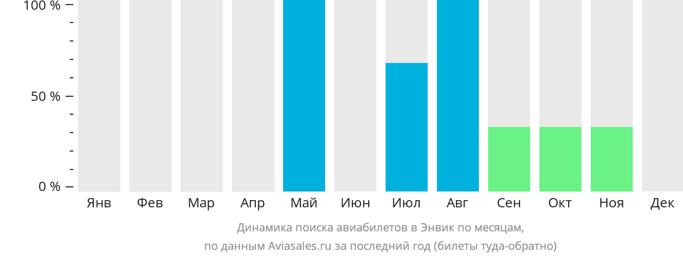 В период высокого спроса рекомендуется приобретать авиабилеты в Энвик заранее. Например, число поисковых запросов в мае достигает максимума в 3 запросов , а в октябре их количество снижается до 33 от максимума.