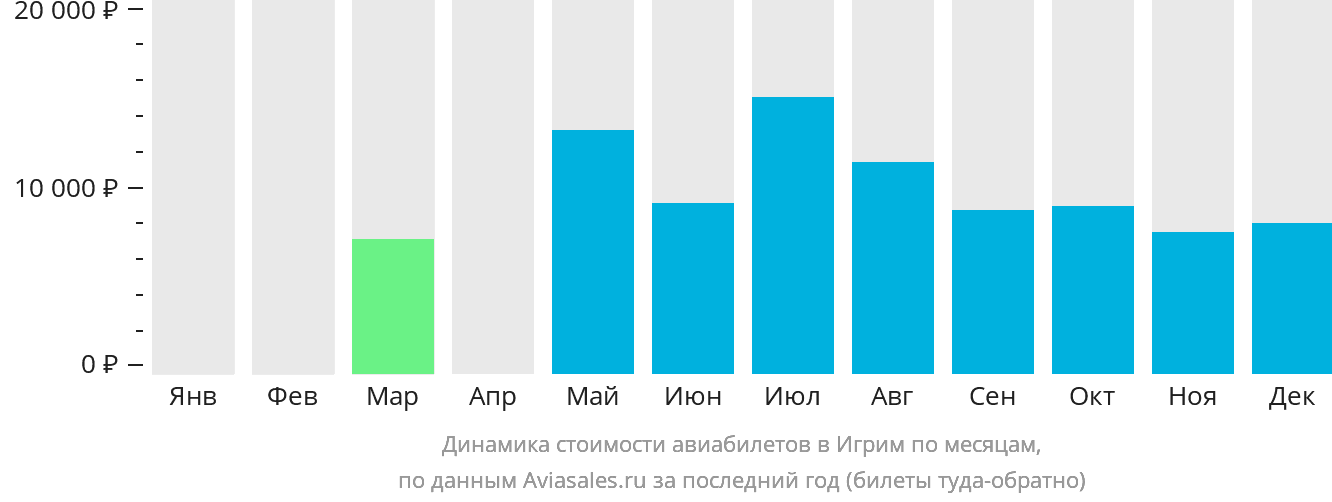 Наибольшей популярностью билеты в Игрим пользуются в июле, августе и декабре. Низким сезоном для покупки билетов является Февраль, Апрель и Май.