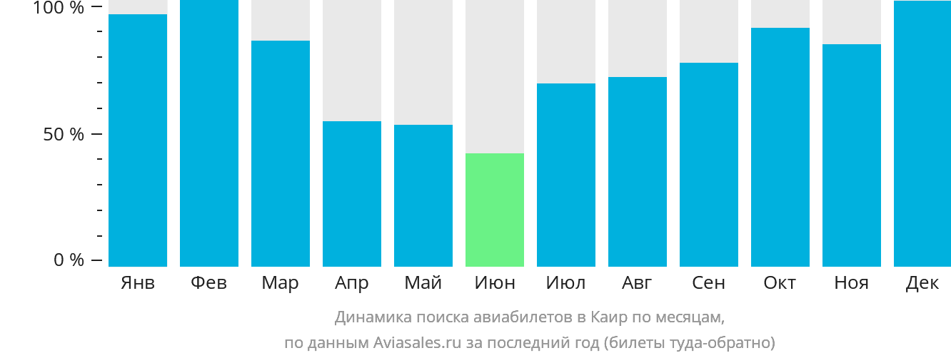 Наибольшей популярностью билеты в Каир пользуются в апреле, июне и июле. Низким сезоном для покупки билетов является Январь, Февраль и Сентябрь.