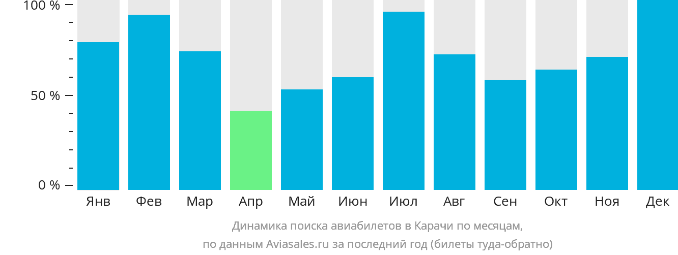 Наибольшей популярностью билеты в Карачи пользуются в январе, мае и июне. Низким сезоном для покупки билетов является Июль, Август и Сентябрь.