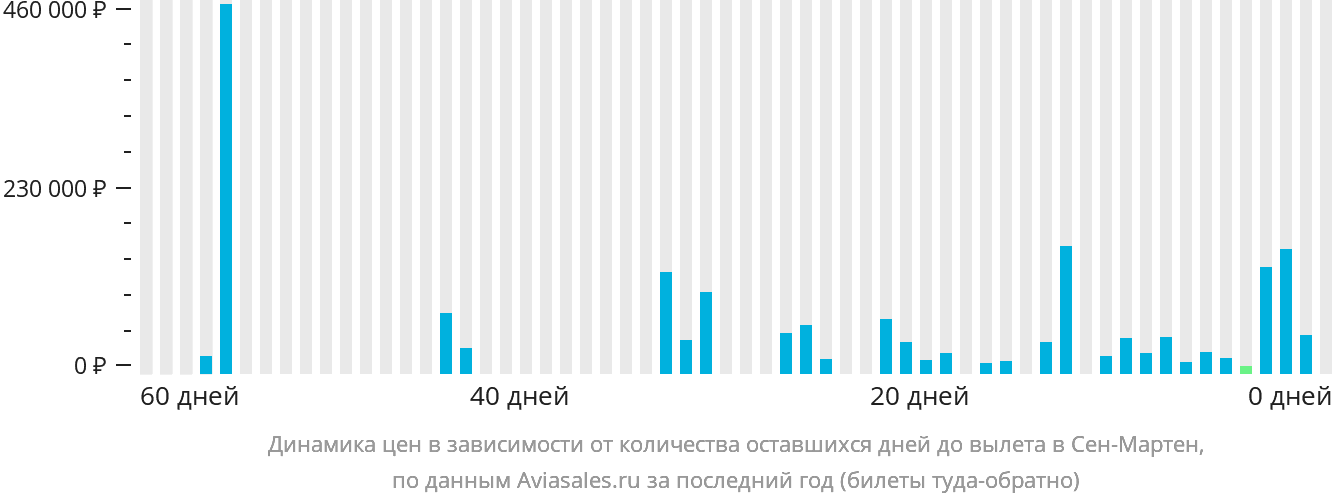 В зависимости от количества дней, оставшихся до вылета, цена билета на самолёт в Сен-Мартен может измениться более чем в два раза.