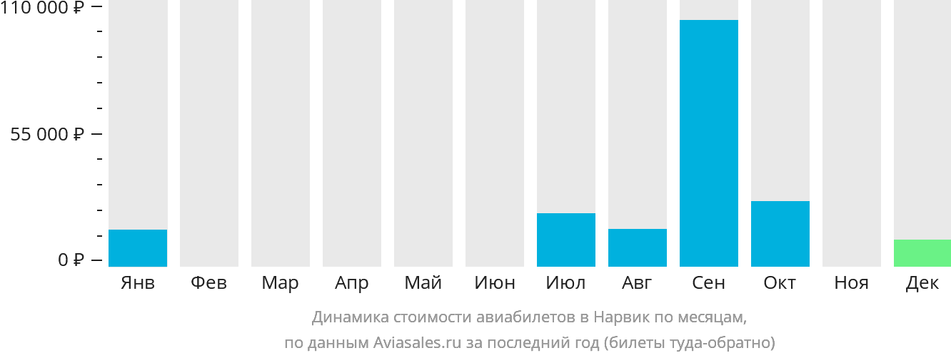 Стоимость перелёта всегда зависит от времени путешествия. График позволит сравнить цены на авиабилеты в Нарвик, проследить динамику изменения их стоимости и найти оптимальное предложение.