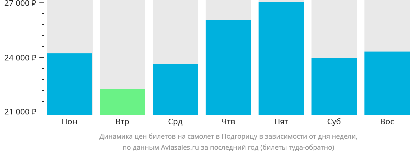 По статистике, самый доступный вариант рейсов в Подгорицу — по вторникам, их средняя стоимость — 22 305 рублей . Наиболее дорогие рейсы — по пятницам, их средняя стоимость — 26 884 рублей . Стоит учесть, что вылеты в предпраздничные дни, как правило, дороже. Мы надеемся, что эти данные помогут вам наиболее эффективно планировать свои путешествия.