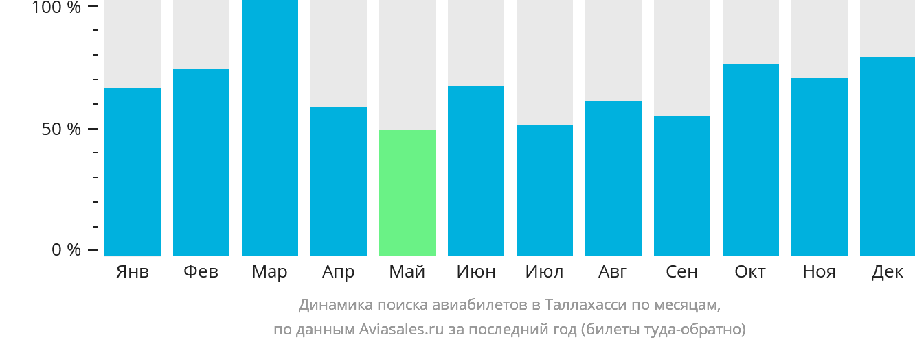 Наибольшей популярностью билеты в Таллахасси пользуются в марте, октябре и декабре. Низким сезоном для покупки билетов является Апрель, Июнь и Сентябрь.