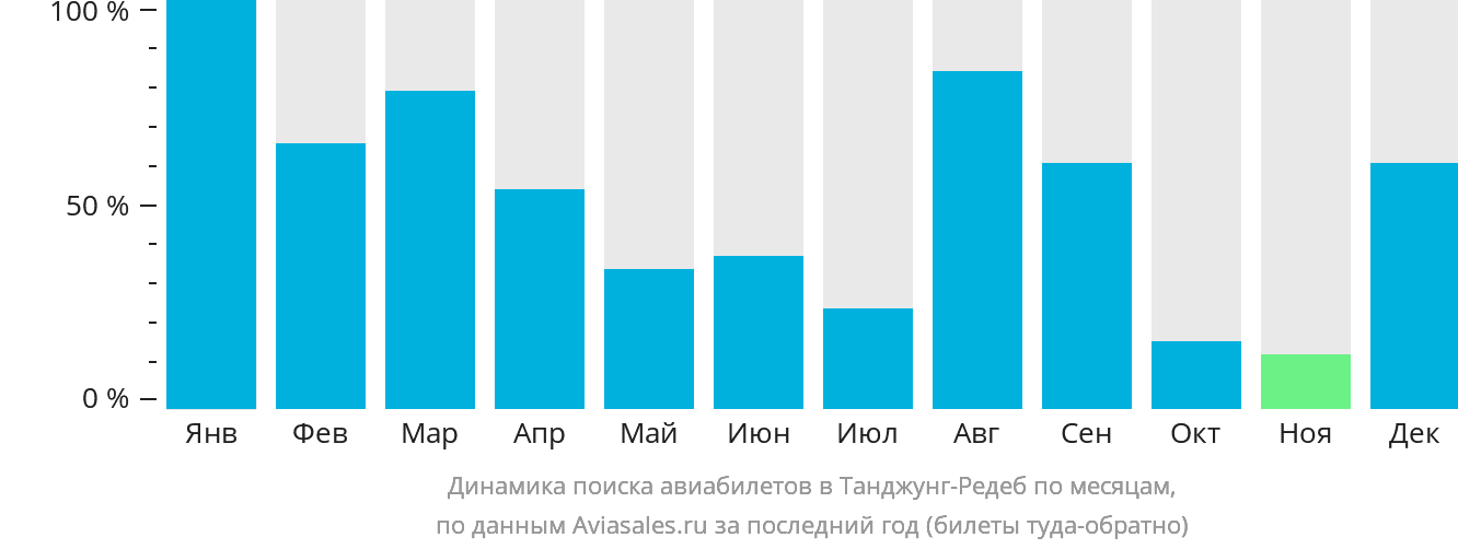 Наибольшей популярностью билеты в Танджунг-Редеб пользуются в январе, марте и мае. Низким сезоном для покупки билетов является Июнь, Ноябрь и Декабрь.