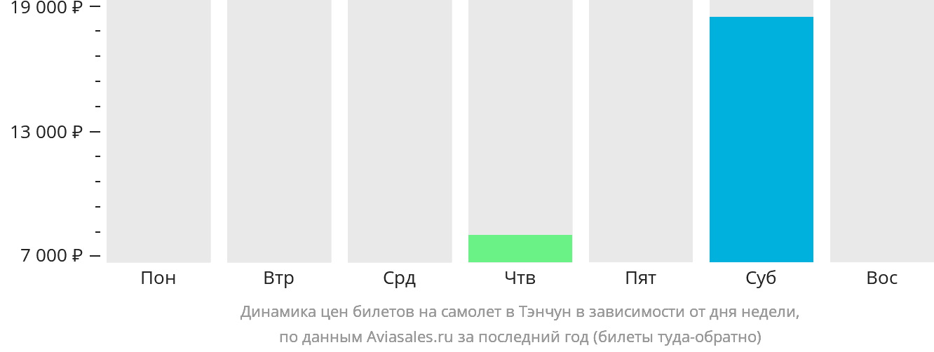 Стоимость авиабилетов в Тэнчун не представляет собой фиксированную и постоянную сумму. Она зависит от множества факторов, в том числе и от дня вылета. Динамика изменений видна на графике.