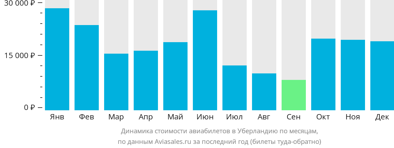 Наибольшей популярностью билеты в Уберландию пользуются в июле, октябре и декабре. Низким сезоном для покупки билетов является Январь, Март и Апрель.