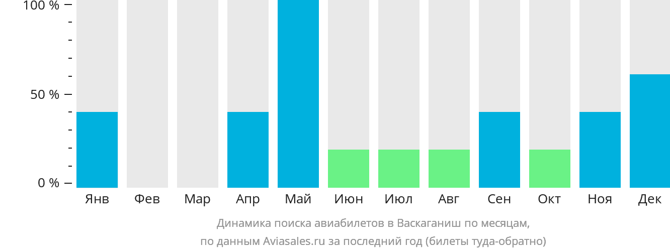 Авиасейлс советует купить авиабилеты в Васкаганиш заранее, чтобы вы могли выбирать условия перелёта, ориентируясь на свои пожелания и финансовые возможности.