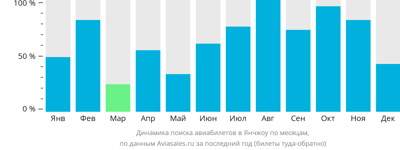 Наибольшей популярностью билеты в Янчжоу пользуются в августе, сентябре и декабре. Низким сезоном для покупки билетов является Январь, Июнь и Июль.