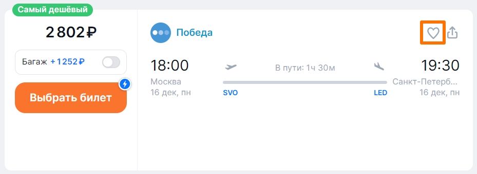 Чтобы следить за ценой на подходящий билет, нажмите на сердечко — он сохранится в «Избранное».