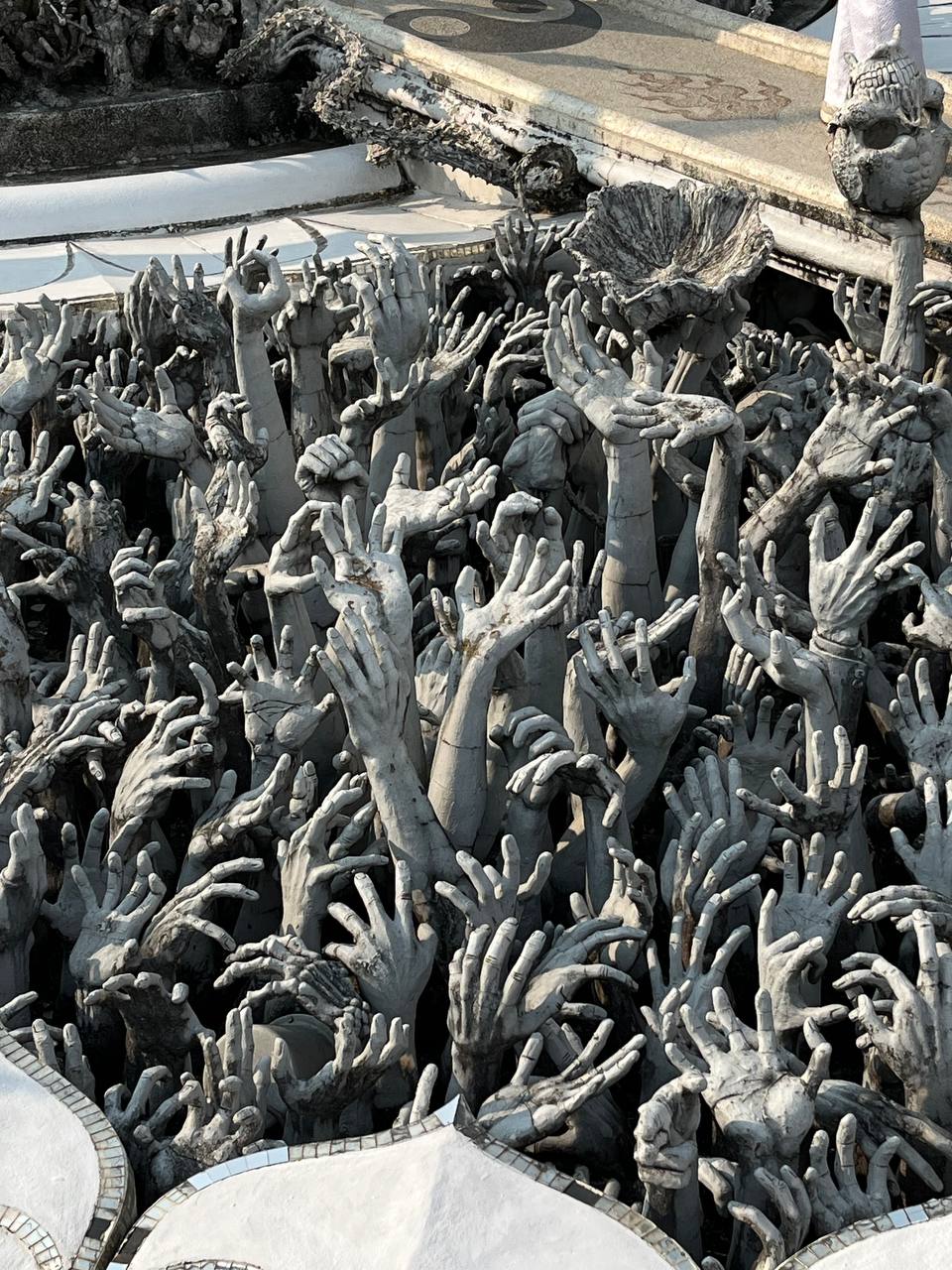 Ради Белого храма мы с подругами арендовали машину и ехали 3 часа из Чиангмая в Чианграй. Входной билет стоил 100 батов с человека (меньше 300 рублей). Но ещё нам пришлось заплатить по 50 батов с каждой за юбки, в которые нужно было облачится: девушек с голыми коленями в храм не пускали.