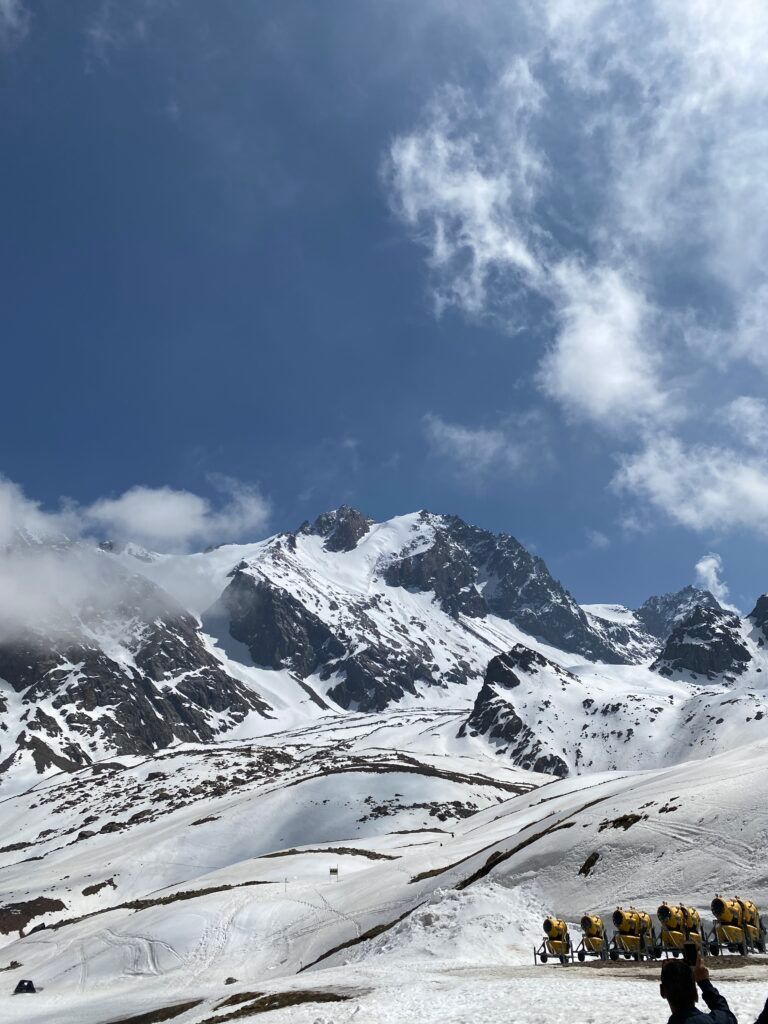 Затем вы поднимаетесь по канатным дорогам «Комби 1» и «Комби 2». Поднявшись по последней, вы попадаете на Большой Талгарский перевал, высота которого — 3167 м. Зимой здесь катаются на лыжах и сноубордах, но и летом жарко не будет, а вот солнечный удар или ожог получить легко, так что одевайтесь и не забудьте солнцезащитный крем! При желании можно поваляться в снегу, а при большом везении, как было у нас, казахи напоят вас водкой. До этого не знала, как быстро алкоголь берёт на высоте.