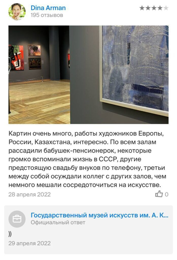 После обеда загляните в музей изобразительных искусств имени Гапара Айтиева. Тут и пейзажи, и импрессионизм, и восхитительная коллекция ковров. Если честно, я пошла в музей из-за отзывов в 2Гис. Если музей там так отвечает, значит, он точно хороший.
