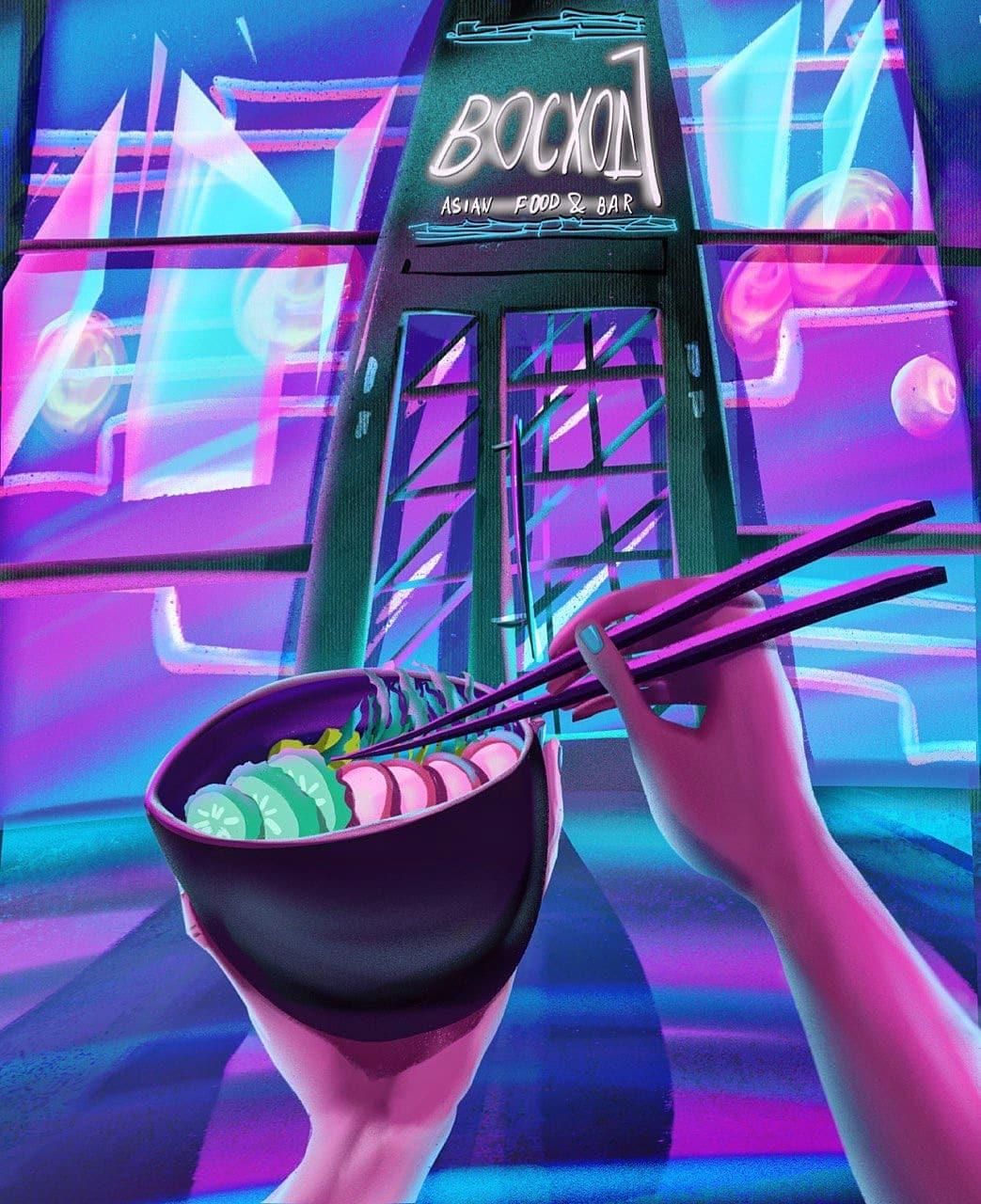 Киберпанк-бар с авторской азиатской кухней, от посещения которого мы остались в полном восторге. Урбанистическое граффити на стене, раковина в виде осколка метеорита, мембрана-паутина из галактических нитей, светильники, напоминающие неведомые галактики, и синие неоновые нити, пронизывающие пространство ресторана. В меню — азиатские закуски, сытные блюда и супы, прошедшие авторскую переработку и готовящиеся на открытой кухне: например, бао с хрустящим цыплёнком в кунжутном соусе, дим-самы со свининой и арахисом чили, гавайский поке и душистый рамен. А за смешиванием азиатских коктейлей, вроде «K-pop» или «China girl», можно понаблюдать, сидя за одинадцатиметровой барной стойкой, которая тянется через все заведение.