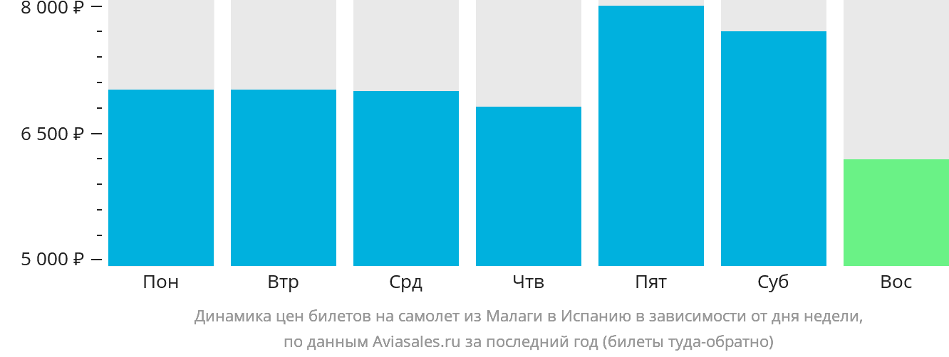 По статистике, самый доступный вариант рейсов из Малаги в Испанию — по воскресеньям, их средняя стоимость — 6 190 рублей . Наиболее дорогие рейсы — по пятницам, их средняя стоимость — 7 922 рублей . Стоит учесть, что вылеты в предпраздничные дни, как правило, дороже. Мы надеемся, что эти данные помогут вам наиболее эффективно планировать свои путешествия.