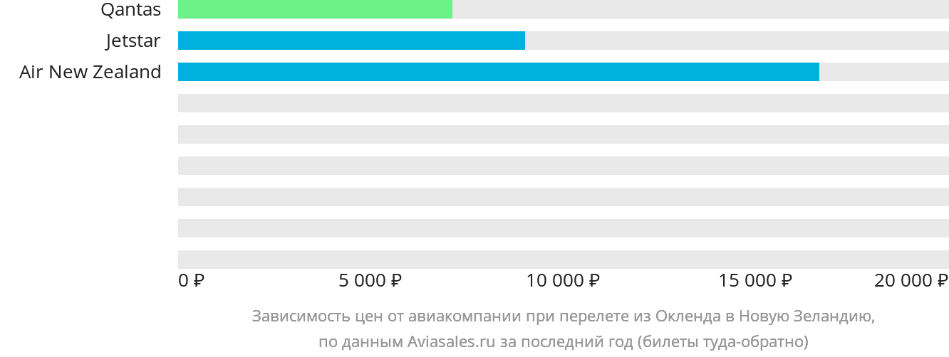 На графике приведены сравнительные цены на авиабилеты из Окленда в Новую Зеландию самых популярных авиакомпаний. Опираясь на эту информацию, вы сможете спланировать свою поездку и купить авиабилеты из Окленда в Новую Зеландию у подходящего вам перевозчика.