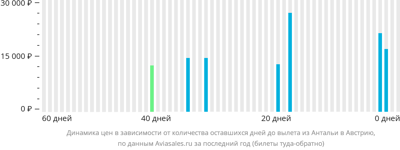 Посмотрите, как менялась цена на авиабилеты из Антальи в Австрию в зависимости от времени покупки. С начала продаж их стоимость меняется в среднем на 114%. Минимальная цена по направлению из Антальи в Австрию — за 41 день до вылета , примерно 12 314 рублей . Максимальная цена по направлению из Антальи в Австрию — за 18 дней до вылета , примерно 26 446 рублей . В большинстве случаев раннее бронирование помогает сэкономить, воспользуйтесь этим!