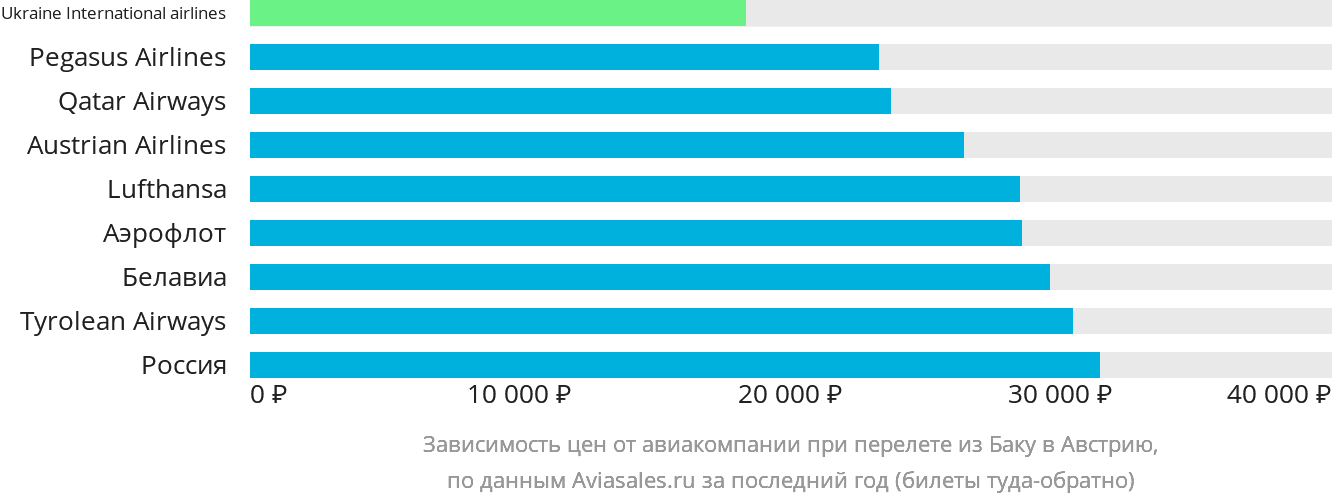 Статистика поможет выбрать рейс, ориентируясь на свои финансовые возможности, а также пожелания в плане комфорта и условий перелёта. Наиболее низкие цены на авиабилеты из Баку в Австрию предлагает Ukraine International airlines, самые высокие цены — Россия.