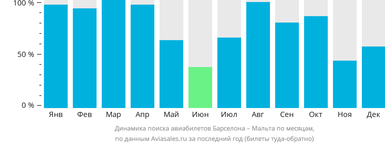 В период высокого спроса рекомендуется приобретать авиабилеты из Барселоны на Мальту заранее. Например, число поисковых запросов в марте достигает максимума в 85 запросов , а в июне их количество снижается до 38 от максимума.