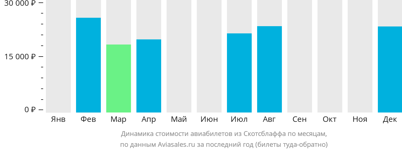 Чаще всего билеты из Скотсблаффа берут на февраль, март и декабрь. Низким сезоном для покупки билетов считается август, сентябрь и ноябрь.