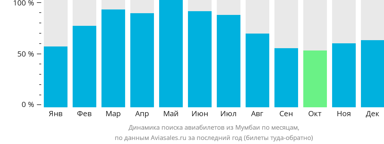 Чаще всего билеты из Мумбаи берут на январь, август и сентябрь. Низким сезоном для покупки билетов считается июнь, июль и ноябрь.