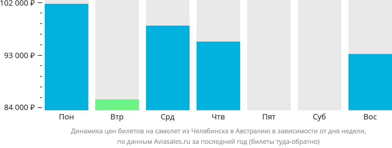 Стоимость перелёта всегда зависит от времени путешествия. График позволит сравнить цены на авиабилеты из Челябинска в Австралию, проследить динамику изменения их стоимости и найти оптимальное предложение.