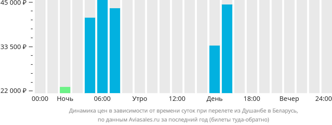 График показывает стоимость вылета в зависимости от времени суток. Например, средняя стоимость билета из Душанбе в Беларусь утром составляет 42 851 рубль . Оцените все условия и выберите оптимальное предложение.