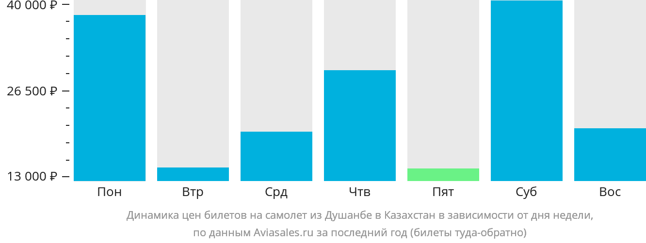 Стоимость авиабилетов из Душанбе в Казахстан не представляет собой фиксированную и постоянную сумму. Она зависит от множества факторов, в том числе и от дня вылета. Динамика изменений видна на графике.
