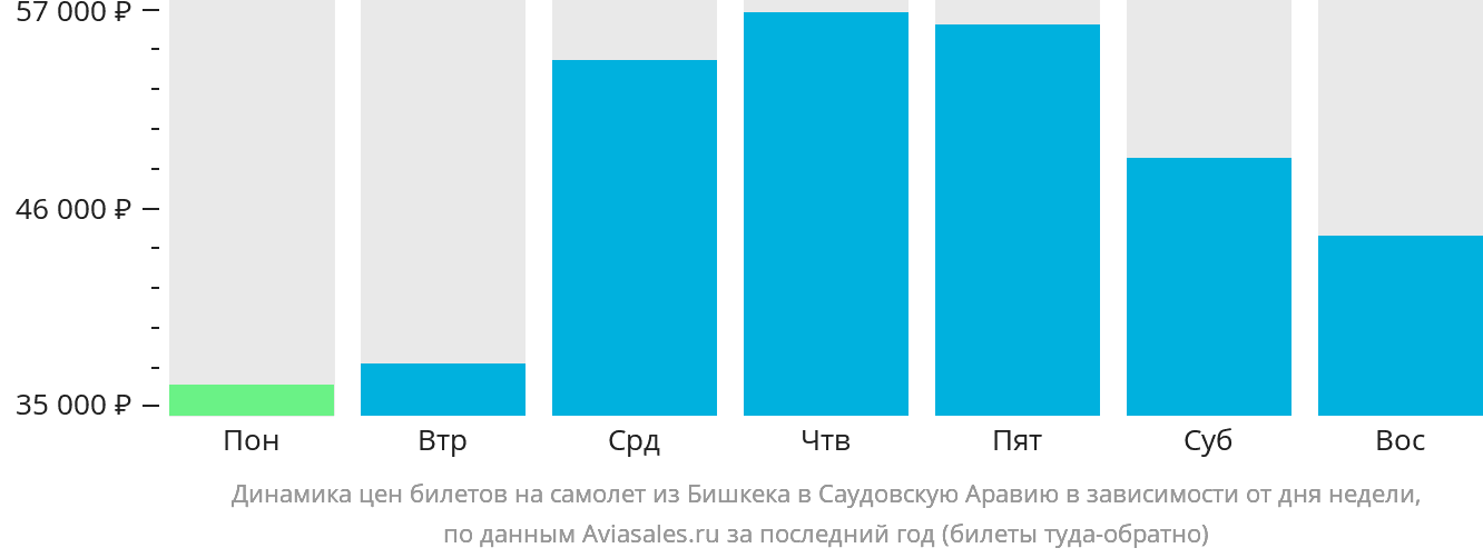 Стоимость авиабилетов из Бишкека в Саудовскую Аравию не представляет собой фиксированную и постоянную сумму. Она зависит от множества факторов, в том числе и от дня вылета. Динамика изменений видна на графике.