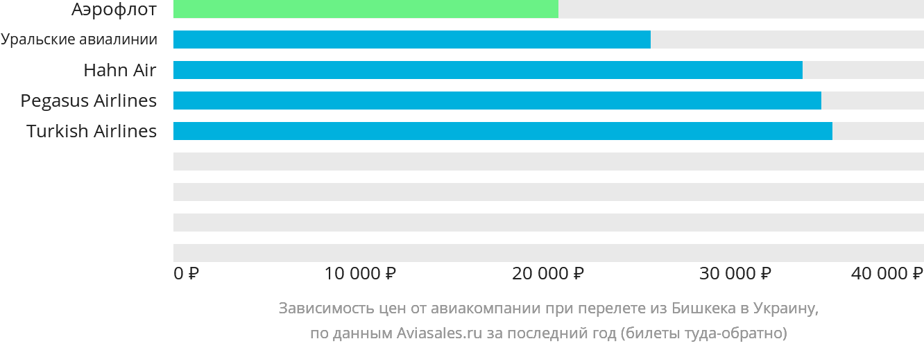 Статистика поможет выбрать рейс, ориентируясь на свои финансовые возможности, а также пожелания в плане комфорта и условий перелёта. Наиболее низкие цены на авиабилеты из Бишкека в Украину предлагает Аэрофлот, самые высокие цены — Turkish Airlines.