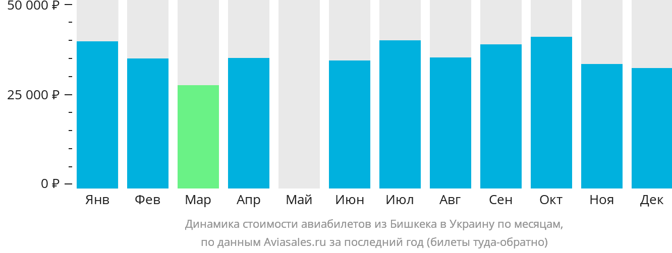 Стоит отметить, что направление Бишкек – Украина пользуется наибольшей популярностью в январе, феврале и декабре. В этот период средняя стоимость авиабилетов составляет 31 605₽ .