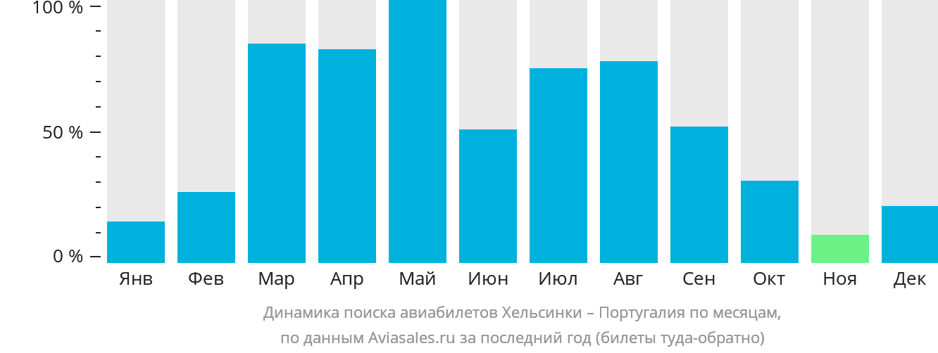 В период высокого спроса рекомендуется приобретать авиабилеты из Хельсинки в Португалию заранее. Например, число поисковых запросов в мае достигает максимума в 3655 запросов , а в ноябре их количество снижается до 10 от максимума.