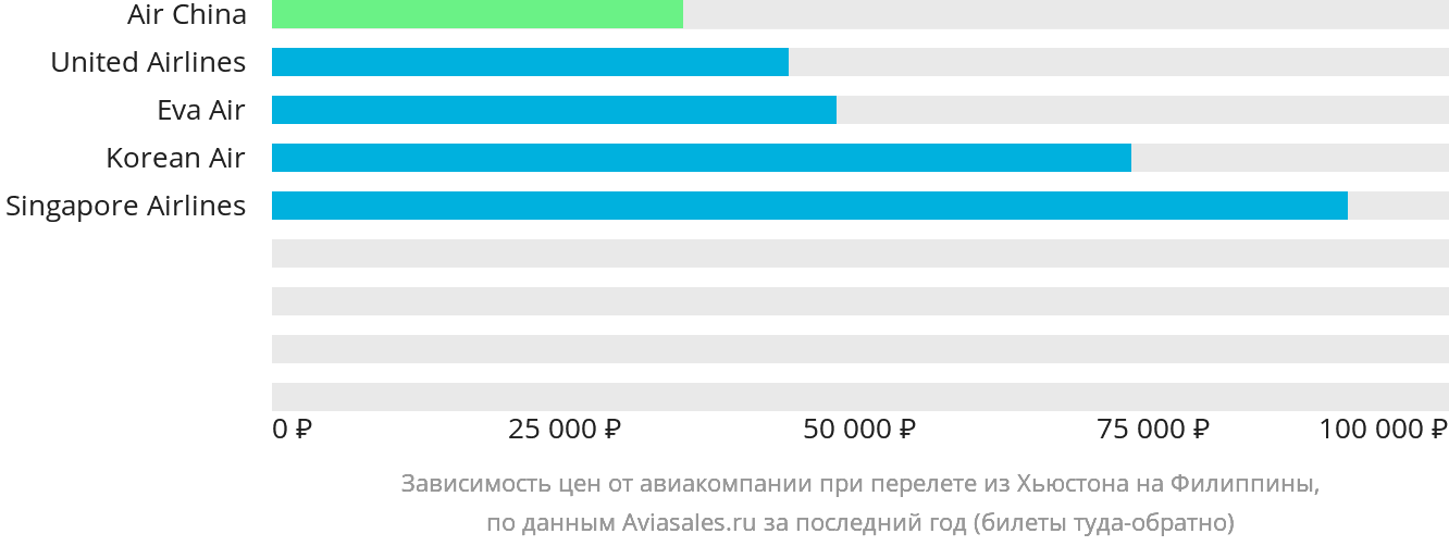 Статистика поможет выбрать рейс, ориентируясь на свои финансовые возможности, а также пожелания в плане комфорта и условий перелёта. Наиболее низкие цены на авиабилеты из Хьюстона на Филиппины предлагает Air China, самые высокие цены — Singapore Airlines.