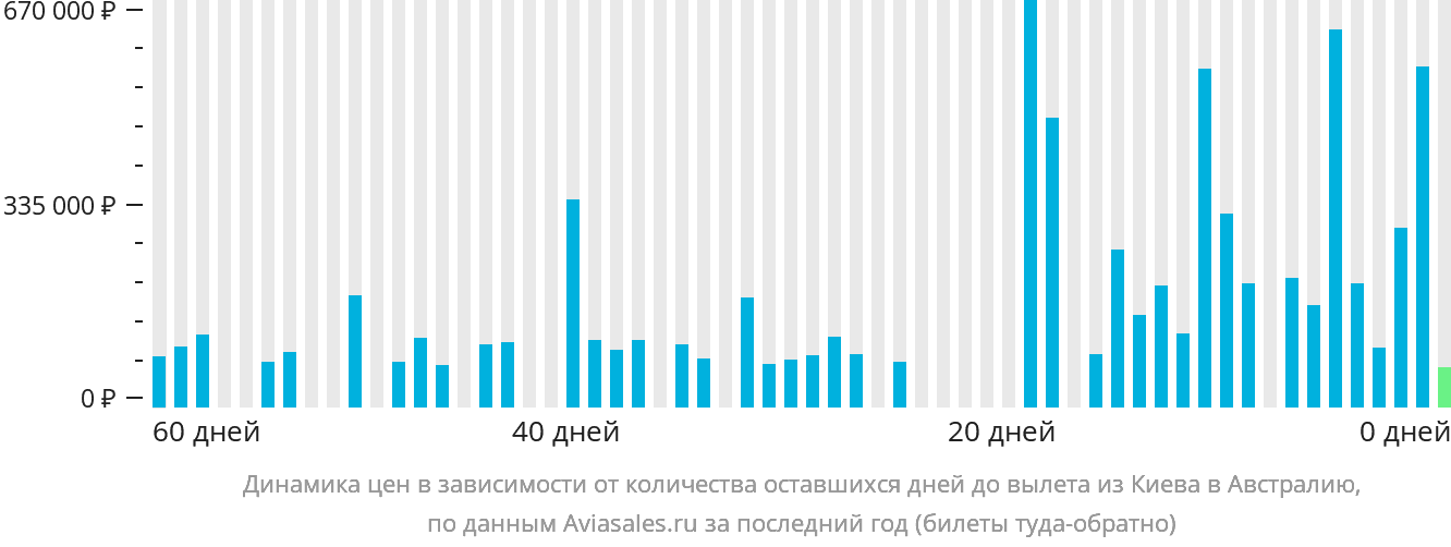 Посмотрите, как менялась цена на авиабилеты из Киева в Австралию в зависимости от времени покупки. С начала продаж их стоимость меняется в среднем на 246%. Минимальная цена по направлению из Киева в Австралию — в день вылета , примерно 62 839 рублей . Максимальная цена по направлению из Киева в Австралию — за 19 дней до вылета , примерно 668 693 рублей . В большинстве случаев раннее бронирование помогает сэкономить, воспользуйтесь этим!