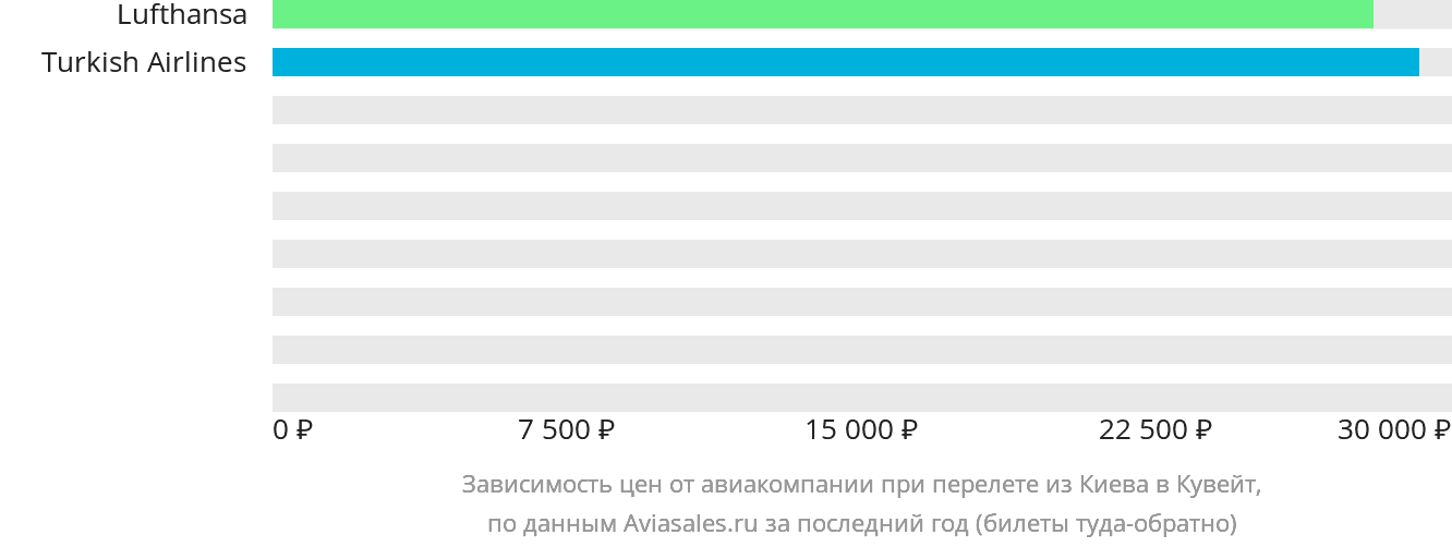 Статистика поможет выбрать рейс, ориентируясь на свои финансовые возможности, а также пожелания в плане комфорта и условий перелёта. Наиболее низкие цены на авиабилеты из Киева в Кувейт предлагает Lufthansa, самые высокие цены — Turkish Airlines.