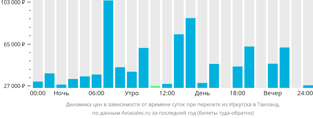 График показывает стоимость вылета в зависимости от времени суток. Например, средняя стоимость билета из Иркутска в Таиланд утром составляет 51 237 рублей , а вечером 50 151 рубль . Оцените все условия и выберите оптимальное предложение.