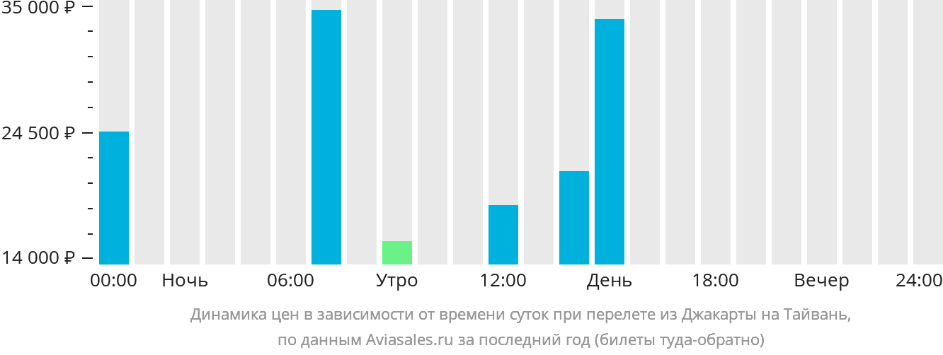 График показывает стоимость вылета в зависимости от времени суток. Например, средняя стоимость билета из Джакарты на Тайвань утром составляет 22 853 рублей . Оцените все условия и выберите оптимальное предложение.