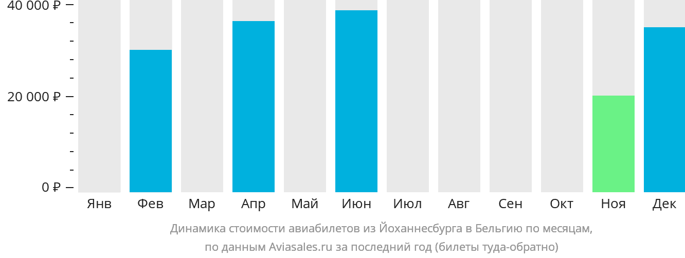 Стоимость перелёта всегда зависит от времени путешествия. График позволит сравнить цены на авиабилеты из Йоханнесбурга в Бельгию, проследить динамику изменения их стоимости и найти оптимальное предложение.