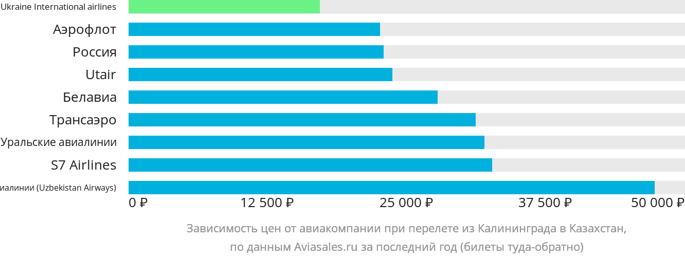 Статистика поможет выбрать рейс, ориентируясь на свои финансовые возможности, а также пожелания в плане комфорта и условий перелёта. Наиболее низкие цены на авиабилеты из Калининграда в Казахстан предлагает Ukraine International airlines, самые высокие цены — Узбекские авиалинии (Uzbekistan Airways).