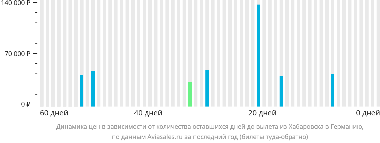Посмотрите, как менялась цена на авиабилеты из Хабаровска в Германию в зависимости от времени покупки. С начала продаж их стоимость меняется в среднем на 219%. Минимальная цена по направлению из Хабаровска в Германию — за 33 дней до вылета , примерно 31 419 рублей . Максимальная цена по направлению из Хабаровска в Германию — за 21 день до вылета , примерно 133 297 рублей . В большинстве случаев раннее бронирование помогает сэкономить, воспользуйтесь этим!