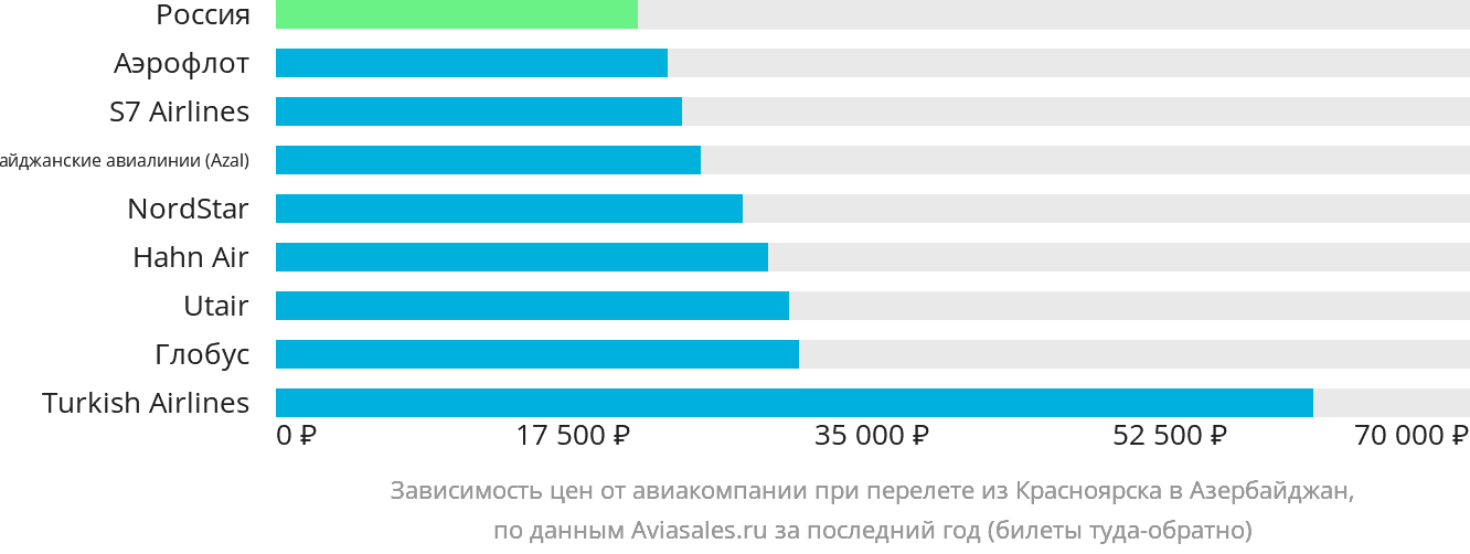 Статистика поможет выбрать рейс, ориентируясь на свои финансовые возможности, а также пожелания в плане комфорта и условий перелёта. Наиболее низкие цены на авиабилеты из Красноярска в Азербайджан предлагает Россия, самые высокие цены — Turkish Airlines.