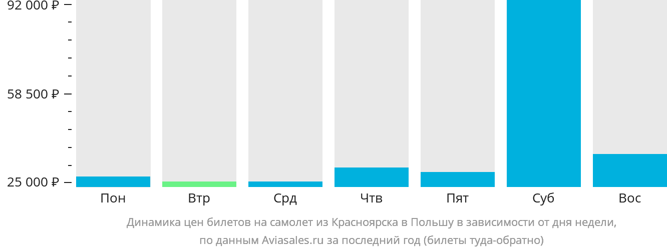 Стоимость авиабилетов из Красноярска в Польшу не представляет собой фиксированную и постоянную сумму. Она зависит от множества факторов, в том числе и от дня вылета. Динамика изменений видна на графике.
