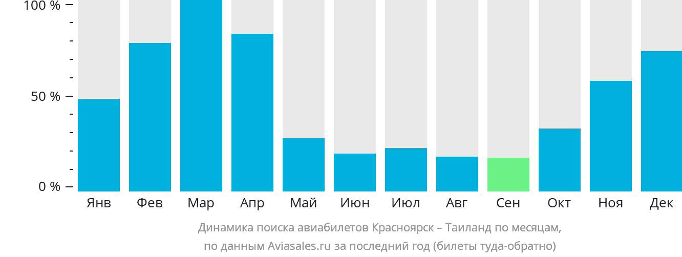 В период высокого спроса рекомендуется приобретать авиабилеты из Красноярска в Таиланд заранее. Например, число поисковых запросов в марте достигает максимума в 9182 запросов , а в сентябре их количество снижается до 17 от максимума.