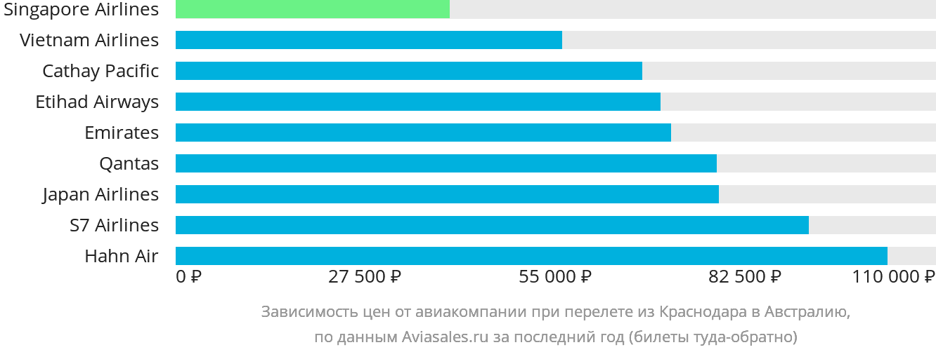 Статистика поможет выбрать рейс, ориентируясь на свои финансовые возможности, а также пожелания в плане комфорта и условий перелёта. Наиболее низкие цены на авиабилеты из Краснодара в Австралию предлагает Singapore Airlines, самые высокие цены — Hahn Air.