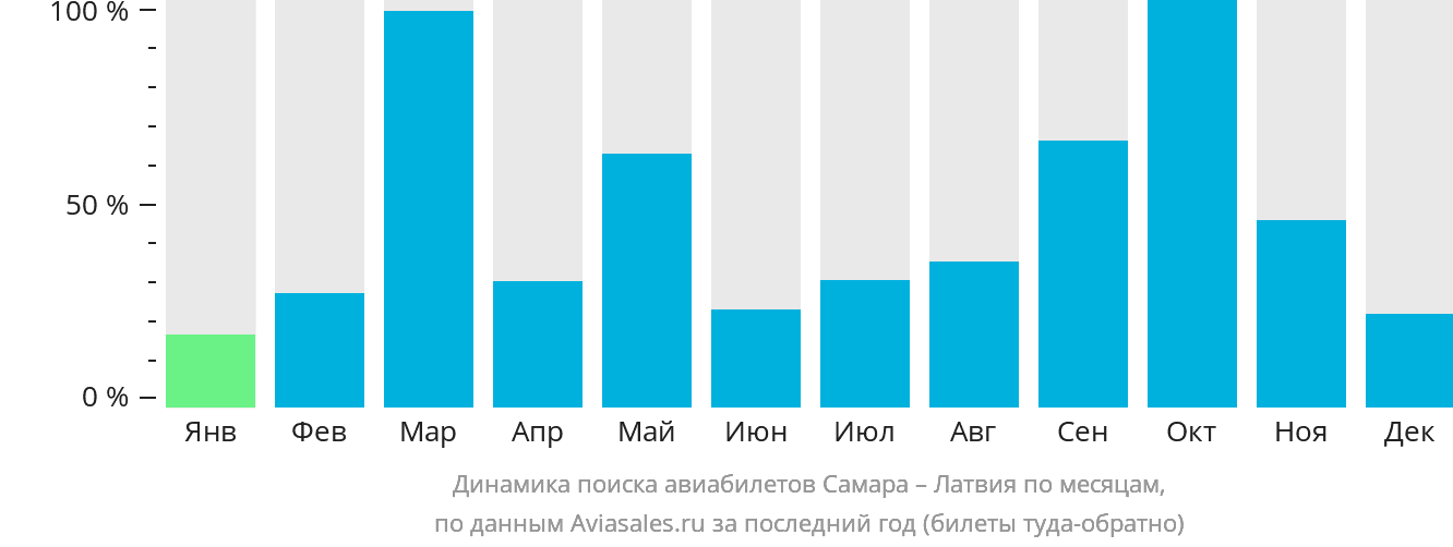 В период высокого спроса рекомендуется приобретать авиабилеты из Самары в Латвию заранее. Например, число поисковых запросов в октябре достигает максимума в 1232 запросов , а в январе их количество снижается до 18 от максимума.