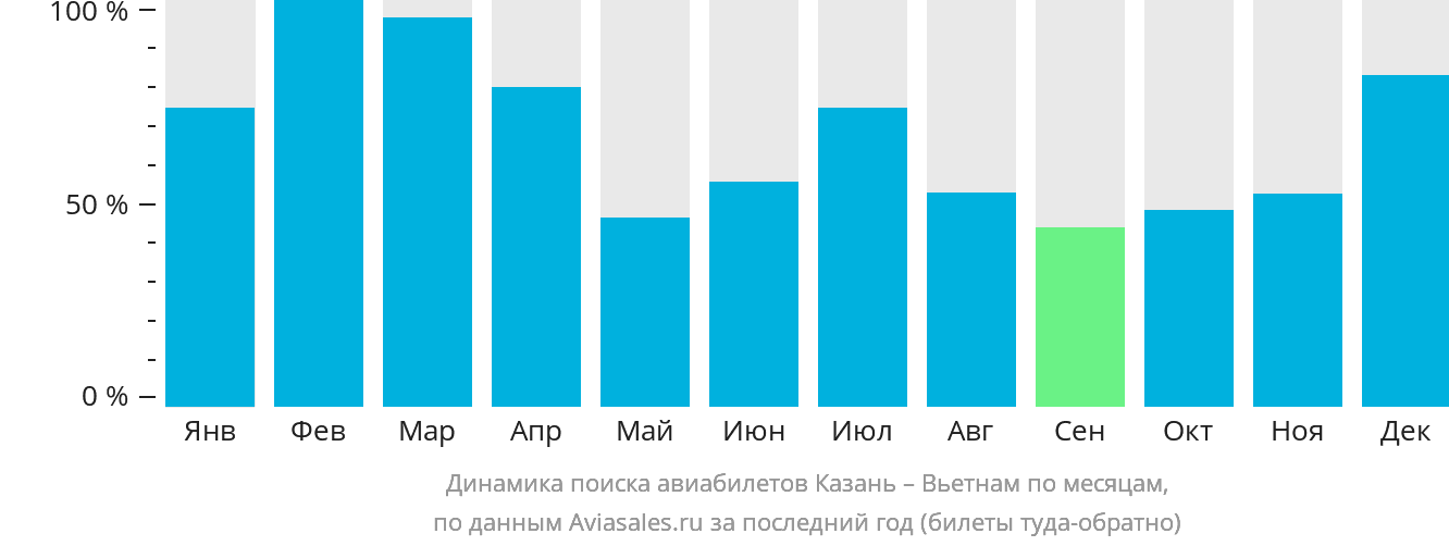 В период высокого спроса рекомендуется приобретать авиабилеты из Казани в Вьетнам заранее. Например, число поисковых запросов в феврале достигает максимума в 1295 запросов , а в сентябре их количество снижается до 44 от максимума.