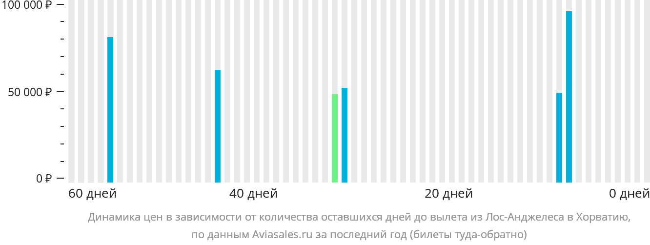 Посмотрите, как менялась цена на авиабилеты из Лос-Анджелеса в Хорватию в зависимости от времени покупки. С начала продаж их стоимость меняется в среднем на 92%. Минимальная цена по направлению из Лос-Анджелеса в Хорватию — за 32 дней до вылета , примерно 47 914 рублей . Максимальная цена по направлению из Лос-Анджелеса в Хорватию — за 8 дней до вылета , примерно 93 484 рублей . В большинстве случаев раннее бронирование помогает сэкономить, воспользуйтесь этим!