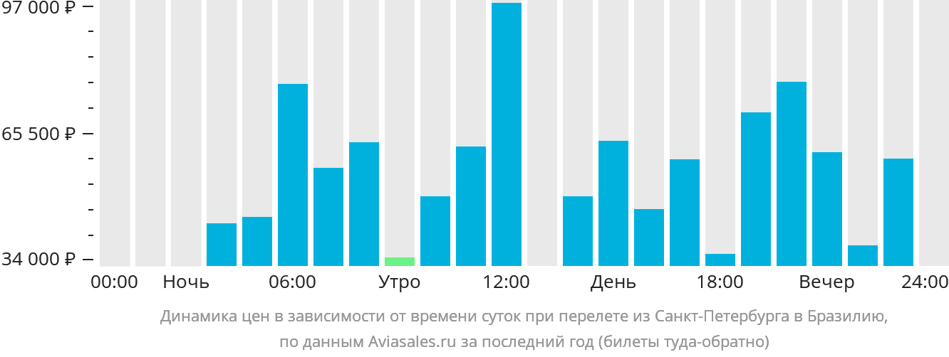 График показывает стоимость вылета в зависимости от времени суток. Например, средняя стоимость билета из Санкт-Петербурга в Бразилию утром составляет 60 712 рублей , а вечером 61 200 рублей . Оцените все условия и выберите оптимальное предложение.