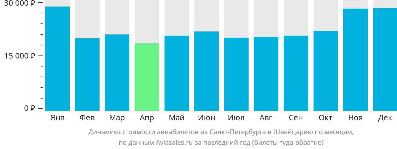 Стоит отметить, что направление Санкт-Петербург – Швейцария пользуется наибольшей популярностью в январе, феврале и марте. В этот период средняя стоимость авиабилетов составляет 19 954₽ .
